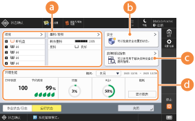 您可以显示一个屏幕来同时检查多个项目的状态,例如剩余的纸张和碳粉量、机器安全措施的状态、解决传真和打印过程中出现的问题的支持信息以及指定时间段内的打印作业状态和功耗。