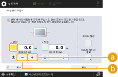 1 | <화상위치 조정> 화면에서 <배율 (a)> 및 <배율 (b)>에 대해 확대/축소 비율(%)을 설정하고  <OK>를 누릅니다. <배율 (a)>입력된 비율에 따라 이송 방향과 평행한 방향으로 이미지를 확대하거나 축소합니다. <배율 (b)>입력된 비율에 따라 이송 방향과 수직 방향으로 이미지를 확대하거나 축소합니다. 필요에 따라 테스트 페이지 용지를 다시 인쇄한 다음 보정 크기를 확인합니다. |