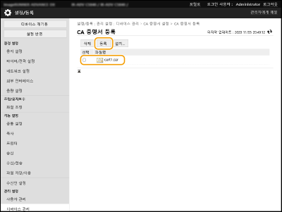 리모트 UI를 사용하여 키/인증서, CA 인증서 및 S/MIME 인증서를 컴퓨터에서 기기에 등록할 수 있습니다. 관리자를 지정하여 이 항목들을 등록합니다.