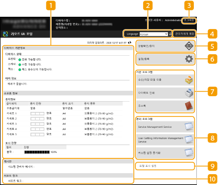 일부 표시 항목 및 기능은 관리자 권한으로 로그인한 경우에만 사용이 가능합니다. 여러 사용자가 리모트 UI를 동시에 작동하거나 기기의 조작 패널이 리모트 UI와 동시에 작동될 경우 수행된 마지막 작업이 유효합니다. |