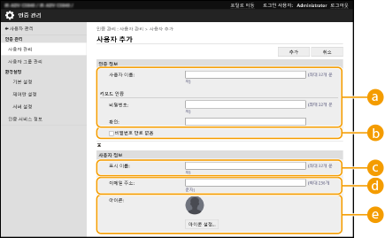 "관리자"가 기본 관리자 이름(사용자 이름)으로 등록됩니다. 이 사용자를 삭제할 수 없지만 "관리자" 권한을 가진 사용자를 추가한 후 비활성화할 수 있습니다. 관리자로 로그인