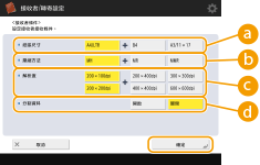 <紙張尺寸>設定接收者可以接收的紙張尺寸。檢查要傳送資料的紙張尺寸是否與接收者裝置的規格一致後,指定該設定。 <A4/LTR>:以 A4/LTR 尺寸傳送。 <A4/LTR> + <B4>:以 A4/LTR 尺寸或 B4 尺寸傳送。 <A4/LTR> + <A3/11×17>:以 A4/LTR 尺寸或 A3/11" x 17" 尺寸傳送。 <A4/LTR> + <B4> + <A3/11×17>:以 A4/LTR 尺寸、B4 尺寸或 A3/11" x 17" 尺寸傳送。 ![]() 若已掃描資料的紙張尺寸小於 <紙張尺寸> 中設定的尺寸,會使用 <紙張尺寸> 中設定的最小紙張尺寸傳送資料並保留空白裝訂邊。 若已掃描資料的紙張尺寸大於 <紙張尺寸> 中設定的尺寸,會縮小資料並使用 <紙張尺寸> 中設定的最大紙張尺寸傳送資料。 根據接收者機器規格設定接收者條件。若要傳送的資料的紙張尺寸大於接收者裝置可以使用的紙張尺寸,則影像可能被裁剪或裁切。 <壓縮方法>選擇壓縮方法。MMR 的壓縮率最高,其次是 MR,然後是 MH。壓縮率愈高,所需的傳輸速度愈短。 <解析度>選擇較高的值可增加解析度並改善影像品質。不過,解析度愈高,所需的傳輸時間愈長。 <分割資料>如果傳送的資料大小超過上限 (<最大傳送資料量>),請選擇要按照大小還是按照頁面來劃分資料。 如果選擇 <開啟>,資料將分割為不超過上限的較小大小,分為多個區段進行傳送。收件者的裝置必須能夠將收到的資料進行合併。 如果在步驟 1 中選擇 <透過伺服器傳送> ( ) 中的 <關閉> 用於指定 I-fax 設定,即使超過上限,傳送資料時也不會分為多個部份。![]() 根據收件者機器規格設定接收者條件。若設定了收件者機器不支援的條件,傳送過程中可能發生錯誤。 |