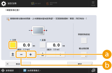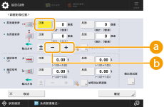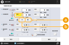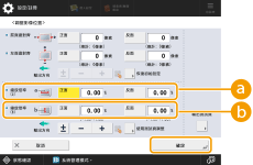 1 | 在 <調整影像位置> 畫面上設定 <縮放倍率(a)> 和 <縮放倍率(b)> 的放大/縮小倍率(%)  按下 <完成>。 <縮放倍率(a)>根據輸入的倍率,朝平行於進紙方向的方向放大或縮小影像。 <縮放倍率(b)>根據輸入的倍率,朝垂直於進紙方向的方向放大或縮小影像。 如有需要,試著重新列印測試頁紙張,並檢查修正量。 |