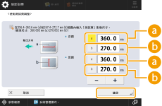 3 | 輸入正面及背面的測試頁長度  按下 <確定>。 例如,如果 <a> 的測量長度為 360.4 mm,請輸入 360.4。長度的差距 (此範例為 0.4 mm) 會自動減少,因此影像會以正確尺寸列印。 <a>輸入測試頁上 <a> 記號的測量長度。 <b>輸入測試頁上 <b> 記號的測量長度。 如有需要,試著重新列印測試頁,並檢查修正量。 |