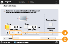 3 | Introduïu la longitud de la pàgina a l'anvers i el revers  premeu <Acceptar>. Per exemple, si la longitud mesurada d'<a> és 360,4 mm, introduïu 360,4. La diferència de longitud (0,4 mm en aquest cas), es redueix automàticament i, per tant, la imatge s'imprimeix amb la mida correcta. <a>Introduïu la longitud mesurada de la marca <a> a la pàgina de prova. <b>Introduïu la longitud mesurada de la marca <b> a la pàgina de prova. Segons calgui, torneu a provar d'imprimir la pàgina de prova i després comproveu-ne la quantitat de correcció. |