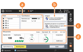 U kunt een scherm weergeven om de status van meerdere opties tegelijk te controleren, zoals de resterende hoeveelheid papier en toner, de status van de beveiligingsmaatregelen van de machine, ondersteuningsinformatie voor het oplossen van problemen tijdens faxen en afdrukken, en de afdrukopdrachtstatus en het energieverbruik binnen een opgegeven tijdsperiode.
