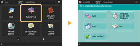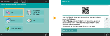 View the function guide and FAQ pagePress <Tutorial/FAQ> to display a screen that introduces what you can do with the functions of the machine as well as tips for using copy, scan, etc. View this screen when you want to learn more about what functions are available and how to use them. You can also access the FAQ page from a mobile device. ![]() Example 1: Tutorial for Copy functions When you select an item from the list, the tutorial screen is displayed. ![]() Example 2: Display the FAQ page Pressing <FAQ> displays a QR code. You can then display the FAQ page for the machine by scanning this QR code on a mobile device such as a smartphone or tablet. ![]() Use the Help functionDepending on the function being displayed, is sometimes displayed on the upper-right of the screen. Press to check the description and operation method of the function.![]() Press <End Communication> to return to the previous screen. Operate in the same manner as with a smartphone (flick/drag-and-drop)On some screens, you can switch the page or scroll by flicking your finger up/down or left/right on the screen as you would with a smartphone. ![]() ![]() You can also disable flick operations. <Use Flick Function> Flick operations and drag-and-drop operations cannot be used when <Invert Screen Colors> is set to <On>. <Invert Screen Colors> On screens with movable buttons, the buttons can be dragged and dropped to move them. ![]() |