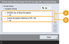 If you set <Format Encryption Method to FIPS 140> to <On>, you can make the TLS communication encryption method comply with the United States government-approved FIPS (Federal Information Processing Standards) 140, but the following limitations apply. An error will occur if you specify a certificate for TLS that uses an algorithm not recognized by FIPS (lower than RSA2048bit). A communication error will occur if the communication destination does not support FIPS-recognized encryption algorithms. <CHACHA20-POLY1305> and <X25519> can no longer be used |