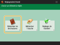 Pour enregistrer un destinataire pour votre propre usage, vous devez vous connecter avec la gestion de l'authentification personnelle. Gestion des utilisateurs La mémorisation/modification/suppression de destinations peut également être effectuée à partir des écrans suivants : <Carnet d'adresses> dans l’écran des fonctions de base du fax Opérations de base pour envoyer des fax<Carnet d'adresses> dans l’écran des fonctions de base de la numérisation Opérations de base pour numériser des originaux |