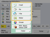 Plusieurs destinataires enregistrés dans le carnet d'adresses peuvent être combinés en un groupe. Pour en savoir plus, consultez la section Enregistrement de plusieurs destinataires pour former un groupe. Pour modifier ou supprimer les informations sur les destinations enregistrées dans le carnet d'adresses, consultez la section Modification des destinataires mémorisés dans le carnet d’adresses. UPN ne peut être utilisé qu'en cas d'envoi à un ordinateur appartenant à un domaine exploité avec un serveur Active Directory. |