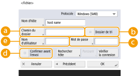 1 | Saisissez le nom d'hôte du serveur de fichiers/Espace avancé qui transmet les données. ![]() Pour toute information sur le serveur de fichiers/Espace avancé, adressez-vous à votre administrateur réseau. <Protocole>Sélectionnez l'un des protocoles suivants pour le serveur de fichiers : <Windows (SMB)>, <FTP> ou <WebDAV>. Lorsque vous envoyez un document à la Espace avancé, sélectionnez <Windows (SMB)> ou <WebDAV>. ![]() Si vous sélectionnez <Windows (SMB)>, les boutons <Rechercher hôte> et <Parcourir> s'affichent. Vous pouvez facilement spécifier un serveur de fichiers/Espace avancé en parcourant le réseau ou en y faisant une recherche. Vous ne pouvez utiliser que <Parcourir> si <1.0> est réglé sur <Oui> dans <Spécifier version client SMB>. Vous pouvez enregistrer jusqu'à cinq serveurs Directory utilisés dans <Parcourir>. <Nom d'hôte>Saisissez le nom d'hôte du serveur de fichiers/Espace avancé. Si vous sélectionnez <FTP> pour le protocole, saisissez le <Nom d'hôte > comme suit. Quand TLS est désactivé Exemple : Pour enregistrer sur l'espace partagé : ftp://<nom d’hôte>/partager Pour enregistrer sur l'espace personnel : ftp://<nom d’hôte>/utilisateurs Quand TLS est activé Exemple : Pour enregistrer sur l'espace partagé : ftps://<nom d’hôte>/partager Pour enregistrer sur l'espace personnel : ftps://<nom d’hôte>/utilisateurs Lorsque vous envoyez un document à la Espace avancé, saisissez <Nom d'hôte> comme suit. Si vous sélectionnez <Windows (SMB)> pour le protocole Exemple : Pour enregistrer sur l'espace partagé : \\192.168.100.50\share Pour enregistrer sur l'espace personnel : \\192.168.100.50\users Si vous sélectionnez <WebDAV> pour le protocole, saisissez le <Nom d'hôte> comme suit, puis appuyez sur <Suivant>. Quand TLS est désactivé Exemple : Pour enregistrer sur l'espace partagé : http://<adresse IP ou nom d'hôte>/ Pour enregistrer sur l'espace personnel : http://<adresse IP ou nom d'hôte>/ Quand TLS est activé Exemple : Pour enregistrer sur l'espace partagé : https://<adresse IP ou nom d'hôte>/ Pour enregistrer sur l'espace personnel : https://<adresse IP ou nom d'hôte>/ <Vérifier la connexion>Appuyez sur ce bouton après avoir saisi le nom d'hôte pour vérifier la connexion avec le serveur de fichiers/Espace avancé. ![]() Si vous utilisez un service de connexion tel que la gestion de l'authentification personnelle, il est nécessaire de saisir <Nom d'utilisateur> et <Mot de passe>. |