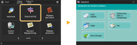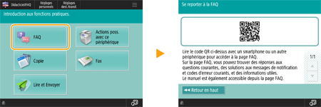 Consultez le guide de fonctionnement et la page FAQAppuyez sur <Didacticiel/FAQ> pour afficher un écran vous présentant les fonctions de l'appareil et vous donnant des conseils au sujet de la copie ou de la numérisation. Consultez cet écran si vous souhaitez en savoir plus sur la disponibilité et l'utilisation des fonctions. Vous pouvez aussi accéder à la page FAQ depuis un dispositif mobile. ![]() Exemple 1 : didacticiel des fonctions de copie Si vous sélectionnez un élément de la liste, l'écran du didacticiel s'affiche. ![]() Exemple 2 : Afficher la page FAQ Appuyez sur <FAQ> pour afficher un code QR. Vous pouvez ensuite afficher la page FAQ de l’appareil en scannant le code QR sur un dispositif mobile tel qu’un smartphone ou une tablette. ![]() Utilisation de la fonction d’aideSelon la fonction affichée, apparaît dans la partie supérieure droite de l’écran. Appuyez sur pour consulter la description et le mode d’emploi de la fonction.![]() Appuyez sur <Fin de communication> pour revenir à l'écran précédent. Fonctionnement similaire à celui d’un smartphone (balayage, glisser-déposer)Dans certains écrans, vous pouvez passer d'une page à une autre ou faire défiler l'écran en effectuant un mouvement de balayage avec votre doigt, vers le haut, le bas, la gauche ou la droite, comme vous le feriez avec un smartphone. ![]() ![]() Vous pouvez également désactiver l'option permettant de faire défiler le contenu ou avec un doigt. <Utiliser la fonction Glisser> Vous ne pouvez pas utiliser les commandes par balayage de l'écran et glisser-déposer si l'option <Inverser couleurs écran> est réglée sur <Oui>. <Inverser couleurs écran> Dans les écrans qui comportent des touches mobiles, les touches peuvent être déplacées par glisser-déposer. ![]() |