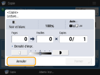 Si vous appuyez sur (Arrêter) sur le panneau de commande alors que des tâches de copie sont en attente, toutes les tâches de copie sont interrompues, puis le message <ArrêtChoisir la tâche de copie à annuler.> et la liste des tâches de copie s'affichent. Vous pouvez sélectionner une tâche de copie dans la liste et l'annuler en appuyant sur <Annuler>. Pour reprendre la copie, appuyez sur <Reprendre copie>. |