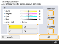 Vous pouvez enregistrer jusqu'à quatre réglages après l'ajustement. Après avoir ajusté la couleur, appuyez sur <Rappel/Mémoriser> sélectionnez un bouton de <C1> à <C4> appuyez sur <Mémoriser> <Oui> <OK>.![]() ![]() Pour rappeler les réglages enregistrés, appuyez sur <Rappel/Mémoriser>, sélectionnez un bouton et appuyez sur <OK>. Vous pouvez changer les noms d'un bouton de <C1> à <C4>. Sélectionnez le bouton à modifier, appuyez sur <Renommer>, et saisissez le nouveau nom. Pour supprimer les réglages enregistrés, sélectionnez le bouton appuyez sur <Supprimer> <Oui>. |