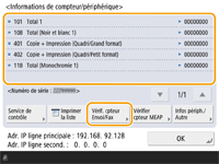 Vous pouvez imprimer une liste indiquant le nombre de pages utilisées pour la copie, impression, numérisation et télécopie. Vous pouvez aussi vérifier les informations des compteurs pour chaque application MEAP. Appuyez sur <Vérifier compteur MEAP> sur l'écran à l'étape 2. Si vous appuyez sur <Infos périph./Autre> <Vérif. config. périphérique> sur le même écran, vous pouvez vérifier les équipements en option installés sur l'appareil.Pour plus d'informations sur les conditions de comptage, contactez votre revendeur ou représentant de service. Pour obtenir des informations sur <Service de contrôle>, contactez votre revendeur ou représentant de service. |