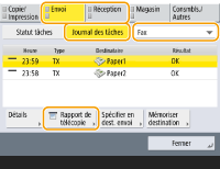 Vous ne pouvez pas configurer les réglages du rapport de télécopie quand <Afficher le journal des tâches> dans <Réglages de gestion> est défini sur <Non>. En outre, si vous modifiez <Afficher le journal des tâches> dans <Réglages de gestion> de <Non> à <Oui>, <Impr./envoyer pour chaque N° spéc. transm.> et <Impr./envoyer à heure spécifiée> dans le rapport de télécopie change automatiquement en <Non>. <Afficher le journal des tâches> |