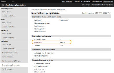 ![]() | De nouveaux microprogrammes sont périodiquement publiés afin d'ajouter des fonctions ou de corriger les défauts des fonctions existantes. Si un nouveau microprogramme est disponible, suivez la procédure ci-après afin de le mettre à jour sur l'appareil. Vous devez disposer des privilèges d'administrateur pour mettre à jour le microprogramme. |