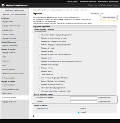 Pour encoder toutes les données de réglage, sélectionnez [Niveau 2] dans [Niveau de sécurité].