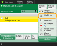 Détermination du haut et du bas de l'originalVous pouvez définir l'orientation du document avant sa numérisation de manière à ce que ses parties haute et basse soient correctement positionnées lors de l'affichage du fichier envoyé/enregistré sur un ordinateur. Si vous chargez un original au format A4, appuyez sur <Options> dans l'écran des fonctions de base de numérisation <Orientation contenu orig.> <Haut contre bord arrière> <OK>.Lorsque vous chargez des originaux de grand format comme des documents au format A3, appuyez sur <Options> dans l'écran des fonctions de base de numérisation <Orientation contenu orig.> sélectionnez <Haut contre bord arrière> ou <Haut contre bord latéral> en fonction de l'orientation de l'original appuyez sur <OK>.Spécifier de multiples destinataires y compris de faxEn définissant <Activer Fax dans fonction Lire et Envoyer> sur <Oui> vous pouvez spécifier des destinataires de fax depuis l'écran Fonctions de base de numérisation (<Afficher fonction Fax>). Ce paramètre est utile pour spécifier de multiples destinataires dont des fax, par exemple quand vous sauvegardez une copie d'un fax envoyé dans un serveur de fichier. Vérifier les images scannées avant de les envoyer/sauvegarderVous pouvez vérifier les images scannées dans l'écran d'aperçu avant l'envoi/sauvegarde. Vérifier les originaux numérisés avant de les envoyer/sauvegarder (prévisualisation) Enregistrement des paramétrages fréquemment utilisésVous pouvez combiner des destinataires et des réglages de numérisation fréquemment utilisés dans un bouton de l'appareil pour une utilisation ultérieure. Pour faire rapidement vos réglages, il vous suffit d'appuyer sur le bouton enregistré lorsque vous numérisez des originaux. Enregistrement d’une combinaison pour les fonctions fréquemment utilisées |