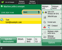Pour sélectionner un destinataire à partir de l'écran <1 touche> après la numérisation, sélectionnez <1 touche> pour <Ecran par défaut>. Cela permet de simplifier la procédure pour envoyer des documents numérisés à un même destinataire. <Ecran par défaut> Les destinations enregistrées dans les boutons 1 touche de l'appareil serveur sont mises à jour aux occurrences suivantes : Lorsqu'une tâche de télécopie a été envoyée sur l'appareil client Lorsque vous appuyez sur la touche (Réinit.) sur la machine clientLorsque la réinitialisation automatique est activée sur l'appareil client |