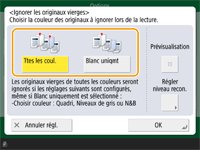 Pour sauter tous les originaux vierges quelles que soient leurs couleurs, sélectionnez <Ttes les coul.>. Pour sauter les originaux vierges uniquement en blanc, sélectionnez <Blanc uniquement>.
