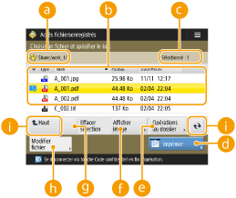 Fichiers et dossiers sauvegardésIndique si les fichiers ou dossiers sont sélectionnés, affiche les icônes signalant le type de fichier ou le dossier, les noms, les formats de fichier et les dates et heures d'enregistrement.