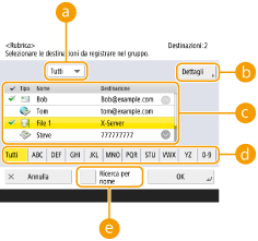 Selezionare (e-mail), (fax), (I-fax) o  (file) per filtrare le destinazioni visualizzate nell’elenco degli indirizzi (). Premere <Tutti> per visualizzare tutte le destinazioni registrate.