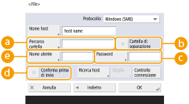 Se si tenta di inviare a un file server/Area di condivisione in cui <Conferma prima di invio> è impostato su <On>, viene visualizzata una schermata che richiede di immettere nome utente e password. In questo caso, immettere la password impostata in precedenza. Se si desidera registrare un file server/Area di condivisione in un indirizzo di gruppo, impostare <Conferma prima di invio> su <Off>. Non è possibile inviare a un indirizzo di gruppo comprendente un file server/Area di condivisione in cui <Conferma prima di invio> è impostato su <On>.