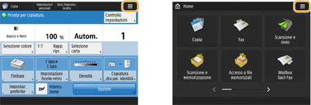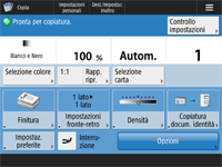 Premere visualizzato nella schermata <Home> e nella schermata funzioni di base per personalizzare la schermata, per esempio ridisponendo i pulsanti o creando un tasto di scelta rapida. Personalizzazione del pannello digitale![]() È possibile modificare le impostazioni relative alla visualizzazione della schermata, come ad esempio quale schermata appare subito dopo l'accensione della macchina e la visualizzazione di un messaggio relativo alla quantità residua di carta e toner. <Impostazioni visualizzazione> È possibile impostare la visualizzazione della schermata dopo che è trascorsa una certa quantità di tempo senza operazioni. <Funzione dopo ripristino automatico> |