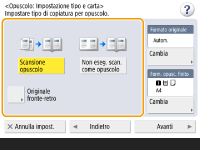 Quando si effettua la copia di opuscoli con originali fronte-retro, premere <Originale fronte-retro> e selezionare <Tipo libro> o <Tipo calendario> come opportuno.