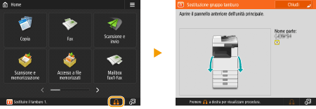 Quando l'unità tamburo si avvicina alla fine del ciclo di vita, appare un messaggio che richiede di sostituire l'unità tamburo nella parte inferiore dello schermo. Premere l'icona in basso a destra dello schermo e seguire le istruzioni sullo schermo per sostituire l'unità tamburo.