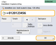 Invio di fax all'esteroImmettere il numero di accesso internazionale, il prefisso del paese e il numero di fax, in quest'ordine. Se non è possibile connettersi alla destinazione all'estero, premere <Pausa> per inserire una pausa tra un numero e il numero successivo. Invio di fax con un sottoindirizzoLa macchina supporta l'uso di sottoindirizzi standard ITU-T*. Se la macchina fax del destinatario è compatibile con l'impiego di sottoindirizzi ITU-T, è possibile aumentare la riservatezza dei documenti inviati usando un sottoindirizzo e una password. Per inviare un documento con un sottoindirizzo, immettere un numero di fax, premere <Sottoindirizzo> o <Impostazione dettagli>, quindi immettere il sottoindirizzo e la password. * Significa International Telecommunication Union-Telecommunication Standardization Sector, ovvero il gruppo che elabora raccomandazioni per la standardizzazione delle comunicazioni a livello mondiale. |