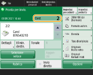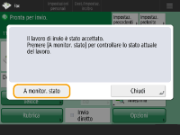 Per verificare il numero totale di destinazioni specificateIl numero totale di destinazioni specificate viene visualizzato in alto a destra della schermata. Ciò consente di verificare che il numero di destinazioni sia corretto prima dell'invio. ![]() Per inviare con le informazioni del mittenteÈ possibile effettuare l'invio con il nome e il numero di fax del mittente. <ID terminale TX> Per controllare lo stato dei documenti inviatiSulla schermata <Monitoraggio stato>, è possibile verificare lo stato dei documenti inviati. Questa schermata consente di inviare nuovamente i fax o di annullare l'invio dopo aver verificato lo stato. Controllo di stato e registro per i documenti inviati e ricevuti Se <Visualizzazione notifica ad accettazione lavoro> è impostato su <On>, la schermata <Monitoraggio stato> potrebbe essere visualizzata dalla seguente schermata, visualizzata dopo la ricezione di un lavoro inviato. <Visualizzazione notifica ad accettazione lavoro> ![]() Quando si verifica un errore di trasmissione perché la linea del destinatario è occupataLa macchina compone nuovamente il numero in automatico dopo un certo periodo di tempo. È possibile cambiare le impostazioni, ad esempio il numero di volte che la macchina ricompone il numero e l'intervallo tra un tentativo e l'altro. <Ricomposizione automatica> Per stampare il rapporto dei risultati dell'invioNella schermata delle funzioni di base fax, premendo <Opzioni> <Rapporto risultato TX> è possibile impostare la stampa automatica del rapporto che elenca i risultati dell’invio.Per impostare per ogni lavoro da <Opzioni>, è necessario selezionare <Solo se errore> o <Off> in <Rapporto risultato TX>, quindi impostare <Consentire stampa da Opzioni> su <On>. Se le foto nell'immagine inviata sono troppo chiare o scure, i colori dello sfondo degli originali non possono essere rimossiLa qualità dell'immagine inviata può essere migliorata se si osservano le seguenti condizioni/impostazioni. Tipo di lavoro: fax (invio memoria) o scansione e invio (Fax/I-fax) <Selezione colore>: <Bianco e Nero> (Scansione e invio) <Tipo di originale>: <Testo> <Densità> <Densità sfondo>: <Autom.><Risoluzione>: 200 dpi x 400 dpi, 300 dpi x 300 dpi*, 400 dpi x 400 dpi, o 600 dpi x 600 dpi* *Impostabile per Scansione e invio <Priorità velocità/qualità immagine per scansione B&N> Lavori di invio fax/I-Fax: <Priorità qualità> (<Priorità velocità/qualità immagine per scansione B&N>)Quando sono impostate più linee telefonicheÈ possibile selezionare la linea telefonica da utilizzare per l’invio dei fax premendo <Opzioni> <Selezione linea>. Per istruzioni su come specificare le impostazioni della linea fax, vedere Impostazioni della linea fax. |