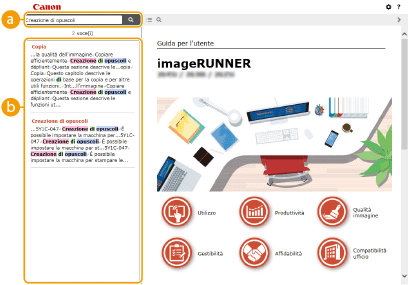 Fare clic su per visualizzare la schermata di ricerca. Contiene una casella di testo per eseguire una ricerca per parola chiave e trovare la pagina cercata.