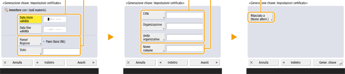 ![]() | La macchina può generare il codice e il certificato (certificato del server) utilizzato per la comunicazione crittografata TLS. Se si desidera iniziare a utilizzare immediatamente la comunicazione crittografata TLS , conviene utilizzare il codice e il certificato preinstallati nella macchina. Se necessario, richiedere a un amministratore di generare un codice e un certificato. Tuttavia, non dimenticare che la comunicazione crittografata TLS non viene abilitata solo generando un codice e un certificato. Configurazione del codice e del certificato per TLS |