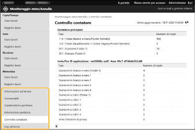 È possibile verificare un gran numero di informazioni sulla macchina, ad esempio informazioni sugli errori, quantità di carta e toner rimanenti, informazioni sulle apparecchiature opzionali collegate e numero totale di pagine che sono state stampate finora.