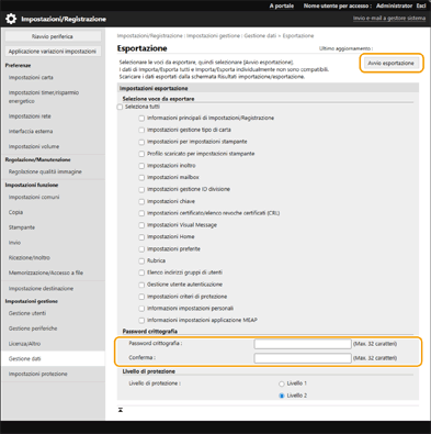 selezionare il livello di sicurezza da [Livello di protezione] fare clic su [Avvio esportazione]