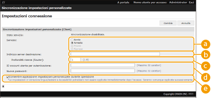 Controllo del registro di comunicazione per la sincronizzazioneÈ possibile controllare il registro di comunicazione dalla schermata per la sincronizzazione delle impostazioni personalizzate. È anche possibile scaricare il registro come file. Quando la macchina server non è in grado di comunicare temporaneamente, "Avviso" viene registrato come livello. "Errore" viene registrato come livello quando la quantità massima di dati che è possibile registrare è stata superata o in caso di errore nell'autenticazione con la macchina server. Impostazioni di sincronizzazione sempliciPer le stampanti multifunzione Canon nello stesso router, è possibile avviare la sincronizzazione delle impostazioni personalizzate dal pannello comandi. Per una macchina client: Premere (Impost/Registr) <Impostazioni gestione> <Gestione periferiche> impostare<Sincronizzazione impostazioni personalizzate (Client)> su <Abilita>.Come metodo di autenticazione deve essere abilitata l'opzione Autenticazione utente. Nota sull'annullamento della sincronizzazioneQuando in una macchina client si annulla la sincronizzazione delle impostazioni personalizzate, tale macchina non sarà più in grado di recuperare le impostazioni di ciascun utente registrato nella macchina server. Pertanto, si tenga presente che i dati personalizzati di una macchina utilizzata come macchina client potrebbero non essere aggiornati dopo l'annullamento della sincronizzazione delle impostazioni personalizzate. |