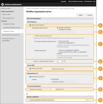 ![]() | Per specificare Active Directory/un server LDAP/Microsoft Entra ID come periferica di autenticazione aggiuntiva, è necessario registrare le informazioni del server utilizzate per l'autenticazione. Se necessario, eseguire un test di connessione. |