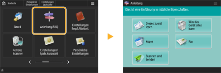 Anzeigen der Funktionsführung und der FAQ-SeiteDrücken Sie <Anleitung/FAQ>, um einen Bildschirm mit Erläuterungen zu den Funktionen des Geräts sowie Tipps zur Verwendung von Kopieren, Scannen usw. anzuzeigen. Schauen Sie sich diesen Bildschirm an, wenn Sie mehr über die verfügbaren Funktionen und ihre Verwendung erfahren möchten. Sie können die FAQ-Seite auch von einem Mobilgerät aus aufrufen. ![]() Beispiel 1: Anleitung für Kopierfunktionen Wenn Sie ein Element in der Liste auswählen, wird der Anleitungsbildschirm angezeigt. ![]() Beispiel 2: Anzeigen der FAQ-Seite Durch Drücken von <FAQ> wird ein QR-Code angezeigt. Sie können dann die FAQ-Seite für das Gerät anzeigen, indem Sie diesen QR-Code mit einem Mobilgerät, wie beispielsweise einem Smartphone oder Tablet, scannen. ![]() Hilfefunktion verwendenJe nach angezeigter Funktion erscheint manchmal oben rechts auf dem Bildschirm. Drücken Sie , um eine Erläuterung zu der Funktion und dem Funktionsverfahren zu lesen.![]() Drücken Sie <Kommunikation beenden>, um zum vorherigen Bildschirm zurückzukehren. Gehen Sie genauso wie bei einem Smartphone vor (streichen/ziehen und ablegen)In einigen Bildschirmen ist es möglich, die Seiten durch Streifen mit dem Finger über den Bildschirm nach oben oder nach unten bzw. nach links oder nach rechts umzublättern oder zu scrollen, und zwar so wie Sie es bei einem Smartphone machen würden. ![]() ![]() Sie können das Streichen auch deaktivieren. <Funktion Wischen verwenden> Streichen sowie Ziehen und Ablegen können nicht verwendet werden, wenn <Bildschirmfarben umkehren> auf <Ein> gesetzt ist. <Bildschirmfarben umkehren> Auf Bildschirmen mit beweglichen Tasten können diese durch Halten und Ziehen verschoben werden. ![]() |