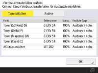 Sie können die verbleibende Menge an Verbrauchsmaterialien über die Remote UI prüfen. Überprüfen des Gerätestatus |