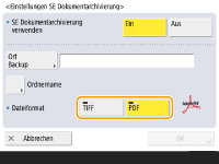 Sie können nicht direkt versenden, wenn <Einstellungen SE Dokumentarchivierung> auf <Ein> gesetzt ist. Diese Einstellung wechselt in den folgenden Fällen zu <Aus>. Geben Sie dann je nach Bedarf das Ziel erneut an oder setzen Sie die Einstellung wieder auf <Ein>. Wenn das Backup-Ziel aus dem Adressbuch gelöscht wurde Wenn ein Adressbuch aus Remote UI importiert wurde Importieren/Exportieren von Einstellungsdaten Wenn ein Adressbuch von der Adressbuch-Verwaltungssoftware empfangen wurde <Import/Export von Adressbuchverwaltungssoftware> |
