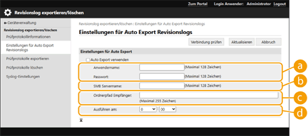 Nach dem erfolgreichen automatischen Export der Revisionslogs werden die gesammelten Revisionslogs automatisch gelöscht. Revisionslogs können nicht manuell gelöscht werden. Nachdem das automatische Exportieren und Löschen der Audit-Protokolle erfolgreich durchgeführt wurde, werden die einzelnen Protokolle generiert. Wenn bis zum Zeitpunkt des nächsten automatischen Exports keine anderen Protokollsammlungen erfolgen, wird das Audit-Protokoll nicht automatisch exportiert. Sie können die Revisionslogs auch manuell über Remote UI exportieren. Exportieren eines Protokolls in eine Datei Wenn der automatische Export fehlschlägt, unternimmt das Gerät mehrere erneute Versuche. Auf dem Bedienfeld des Geräts wird eine Fehlermeldung angezeigt, sobald ein automatischer Export fehlgeschlagen ist. Geben Sie einen SMB-Server für Windows Server 2016 oder höher oder für Windows 10 oder höher an. Bei ausgeschaltetem Gerät wird auch zu den festgelegten Zeiten kein Export durchgeführt. Der Export wird auch beim nächsten Start des Geräts nicht durchgeführt. Wenn sich das Gerät im Schlafmodus befindet, wird es zur festgelegten Zeit automatisch reaktiviert, und der Export wird durchgeführt. Beachten Sie, dass bei Verwendung eines Servers, der eine nach SMB 3.0/3.1 verschlüsselte Kommunikation nicht unterstützt, die Revisionsprotokolldaten beim automatischen Export unverschlüsselt über die Kommunikationspfade übertragen werden. Je nach Umgebung wird der automatische Export von Logs eventuell später als zur festgelegten Zeit durchgeführt. |