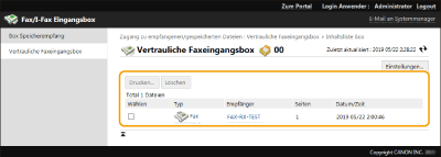 So ändern Sie die Einstellungen einer vertraulichen FaxeingangsboxSie können den Namen und die PIN der gewählten Vertraulichen Faxeingangsbox durch Klicken auf [Einstellungen] auf dem in Schritt 4 angezeigten Bildschirm ändern. |