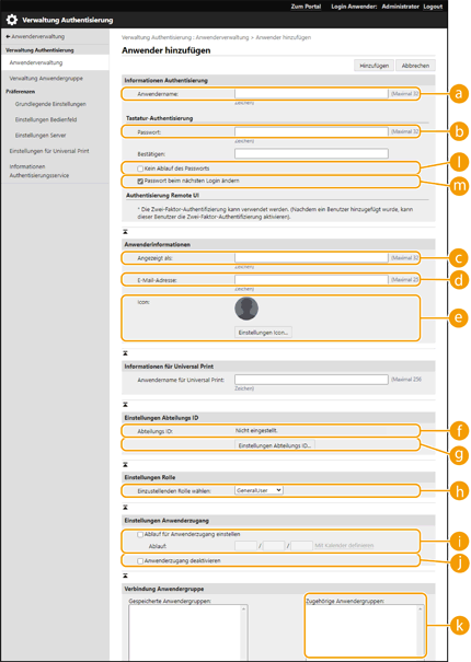 dc | Nein | 0 bis 32 Zeichen | Kontrollzeichen | - (N/A) | Kann nicht geändert werden. Wird den folgenden Benutzern automatisch zugewiesen. Nach Server-Authentifizierung registrierte Benutzer |