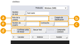 Si trata de realizar envíos a un servidor de archivos/Espacio avanzado en el que <Confirmar antes de enviar> está establecido en <Sí>, aparecerá una pantalla en la que se le solicita que introduzca un nombre de usuario y una contraseña. En este caso, introduzca la contraseña definida previamente. Si desea registrar un servidor de archivos/Espacio avanzado en una dirección de grupo, establezca <Confirmar antes de enviar> en <No>. No puede realizar envíos a una dirección de grupo que incluya un servidor de archivos/Espacio avanzado en el que <Confirmar antes de enviar> está establecido en <Sí>.