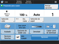 Pulse , que aparece en la pantalla <Inicio> y en la pantalla Funciones básicas, para personalizar la pantalla, reorganizando botones o creando una tecla de acceso directo. Personalizar la pantalla táctil![]() Puede cambiar las opciones de visualización en pantalla, como por ejemplo la pantalla que aparece justo después de encender el equipo, y si aparece el mensaje de papel y tóner restantes. <Opciones de visualización> Puede establecer qué pantalla debe mostrarse cuando haya transcurrido un tiempo sin que se realice ninguna operación. <Función tras reinicio automático> |
