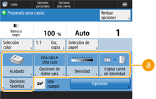 Los botones de opciones que aparecen en la pantalla de funciones básicas (de copia, fax y lectura) se pueden cambiar con otros botones de configuración en <Opciones>. Al situar los botones de opciones de uso frecuente en la pantalla de funciones básicas, puede utilizar las funciones de forma más eficiente. Además, al iniciar sesión con gestión de autenticación personal, puede mostrar una pantalla de funciones básicas personalizada para cada usuario.