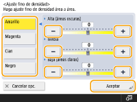 Seleccione un color y ajuste su nivel de densidad por su área de densidad con el botón <-> o <+>. Cuando termine el ajuste, pulse <Aceptar>.