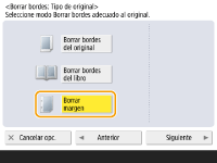 1 | Pulse <Borrar bordes del original> y establezca <Tamaño original>. ![]() Si el tamaño que aparece en <Tamaño original> es distinto al del original que ha configurado, pulse <Cambiar> para seleccionar el tamaño. |